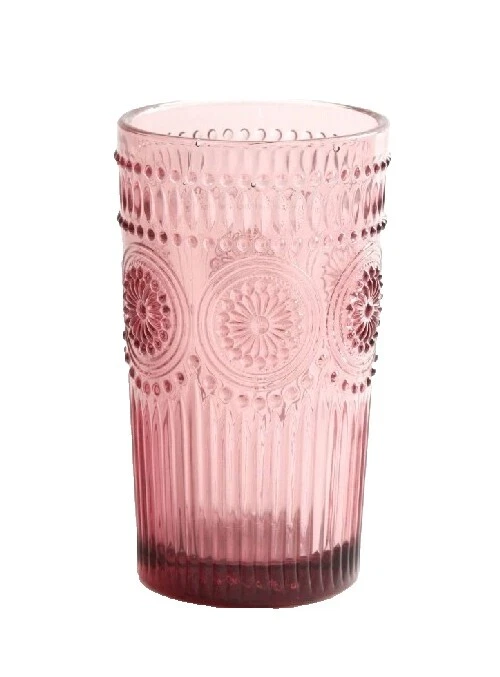 4 Pioneer Woman (?) Vasos bajos de vidrio de 4" con brillo rosa melocotón usados en excelente estado